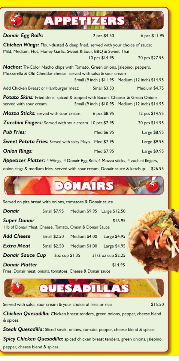 One-pound of donair meat, cheese, tomato, onion, and donair sauce.