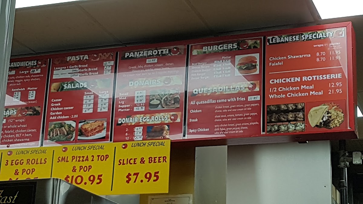 Tender slices of donair meat, mozzarella cheese, onions, tomato, and donair sauce.